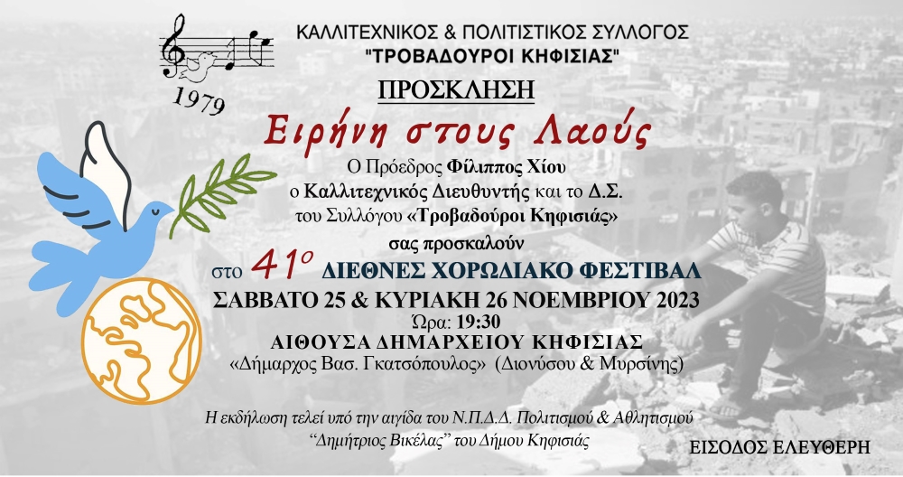 ΣΑΒΒΑΤΟ 25 & ΚΥΡΙΑΚΗ 26 ΝΟΕΜΒΡΙΟΥ 2023 Ώρα: 19:30 ΑΙΘΟΥΣΑ ΔΗΜΑΡΧΕΙΟΥ ΚΗΦΙΣΙΑΣ «Δήμαρχος Βασ. Γκατσόπουλος»  (Διονύσου & Μυρσίνης)