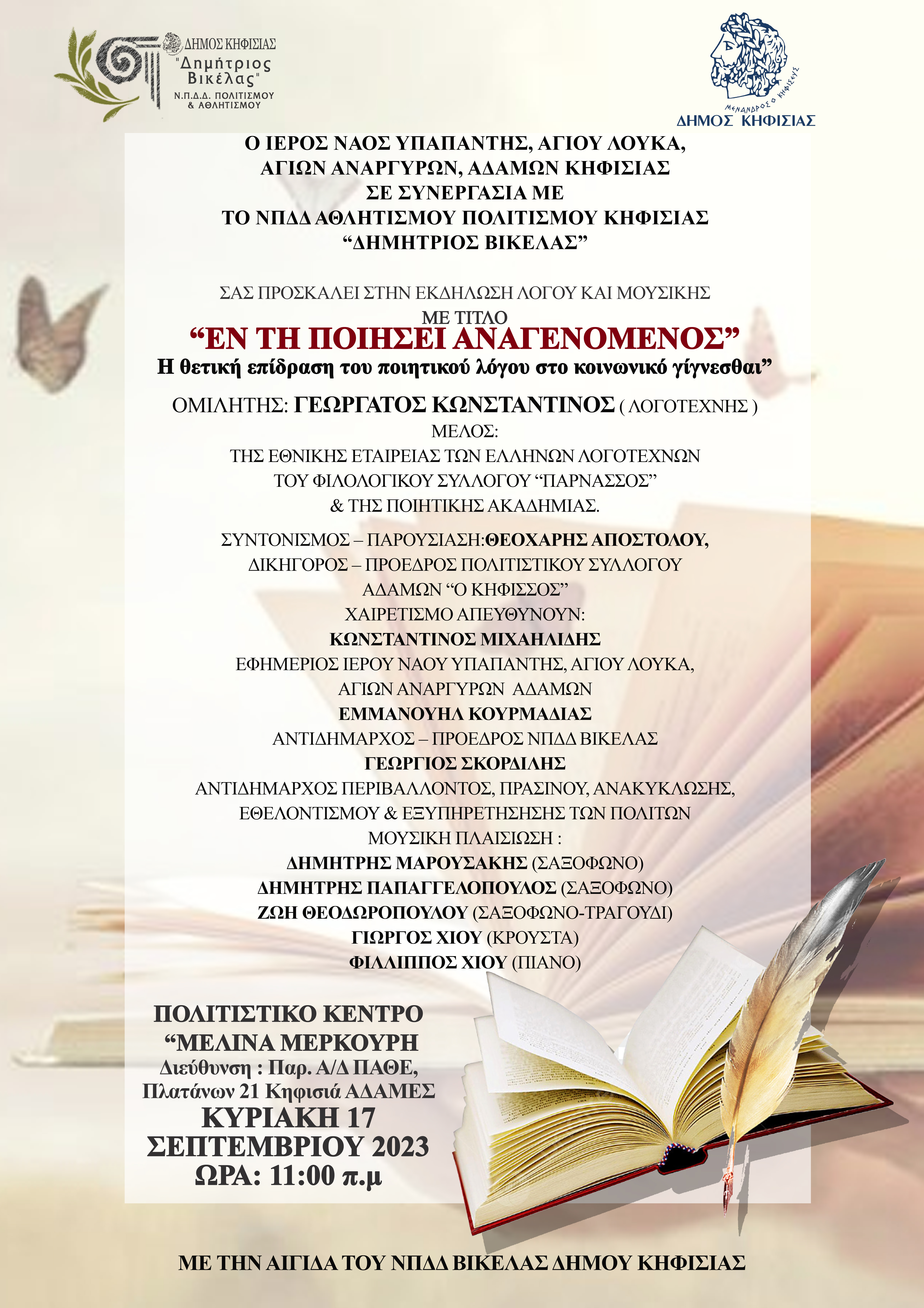 Την Κυριακή 17 Σεπτεμβρίου, στις 11 π.μ, θα πραγματοποιηθεί η ομιλία του πολυβραβευμένου ποιητή, κ. Κωνσταντίνου Γεωργάτου, στο Πολιτιστικό Κέντρο "Μελίνα Μερκούρη" στην περιοχή των Αδαμών στην Κηφισιά.