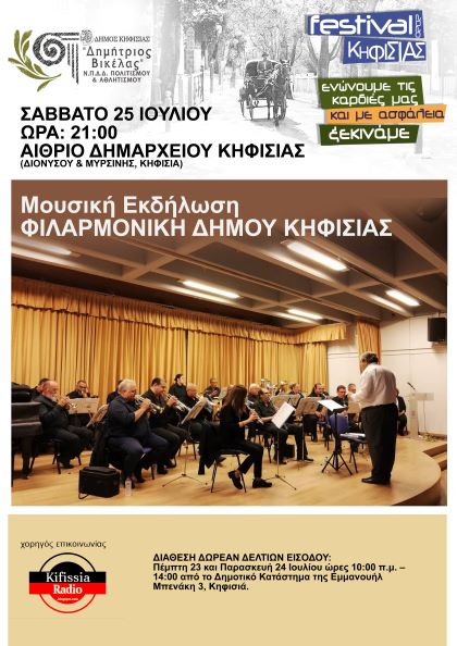 Η αυλαία του Festival Κηφισιάς 2020 στο Αίθριο του Δημαρχείου Κηφισιάς, έπεσε το Σάββατο 25 Ιουλίου με τη Φιλαρμονική του Δήμου μας που υπό την καλλιτεχνική διεύθυνση του συνθέτη και μαέστρου Φίλιππου Χίου, ερμήνευσαν τραγούδια από τη δεκαετία του ’50 έως σήμερα.