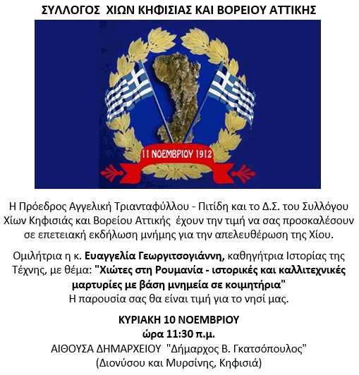 Κυριακή 10 Νοεμβρίου και ώρα 11.30 πμ, η επετειακή εκδήλωση του Συλλόγου Χιών Κηφισιάς Βορείου Αττικής