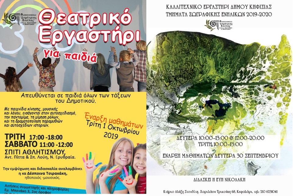 Ξεκίνησαν τα μαθήματα Ζωγραφικής ενηλίκων και το θεατρικό παιχνίδι για τα παιδιά του Δημοτικού στα πλαίσια των μαθημάτων καλλιτεχνικής παιδείας που διοργανώσει το ΝΠΔΔ «Δημήτριος Βικέλας» του Δήμου Κηφισιάς.