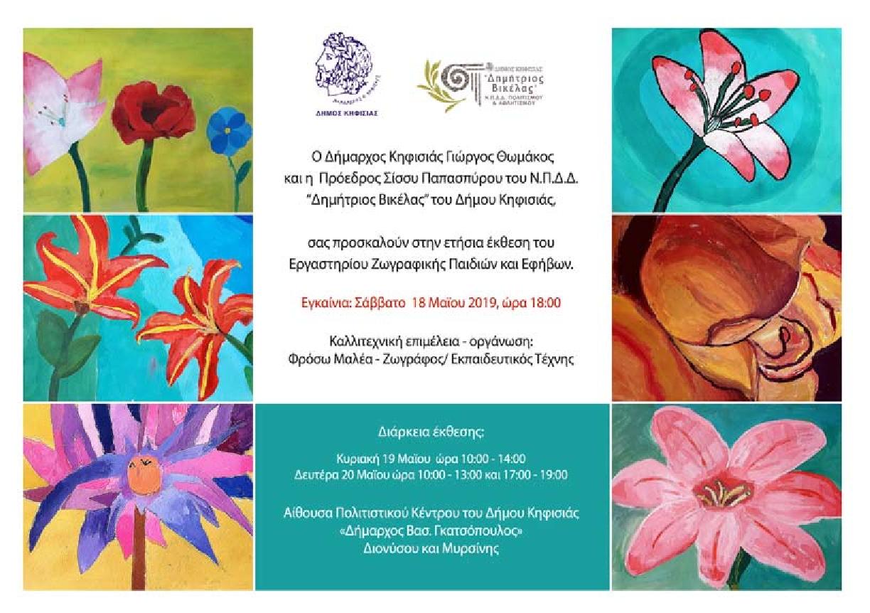 Συνεχίζονται από Τρίτη 2 Ιουλίου έως Τετάρτη 31 Ιουλίου 2019 τα θερινά μαθήματα ζωγραφικής για παιδιά και εφήβους, του εργαστηρίου Ζωγραφικής του Ν.Π.Δ.Δ. Πολιτισμού & Αθλητισμού "Δημήτριος Βικέλας" του Δήμου Κηφισιάς.