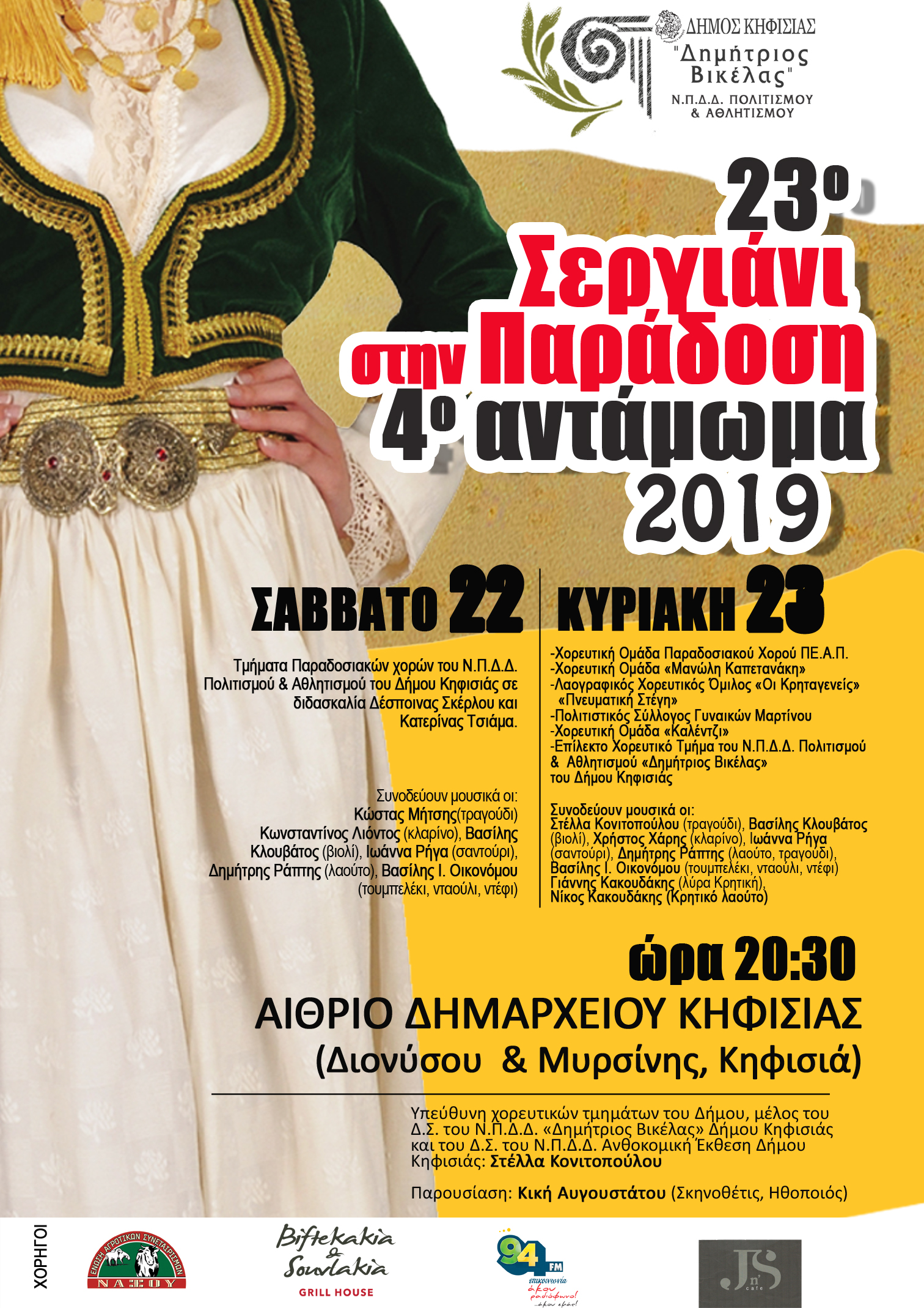 Ο Δήμος Κηφισιάς διοργανώνει την καθιερωμένη πολιτιστική εκδήλωση «Σεργιάνι στην Παράδοση», τιμώντας τα τμήματα παραδοσιακών χορών του Δήμου μας και την παράδοση του τόπου μας, το Σάββατο 22 & την Κυριακή 23 Ιουνίου στις 20:30 στο Αίθριο του Δημαρχείου Κηφισιάς (Διονύσου & Μυρσίνης, Κηφισιά). Η εκδήλωση θα πραγματοποιηθεί σε δύο μέρες.