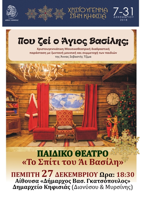 Αποχαιρετώντας το 2018 οι εκδηλώσεις του Δήμου Κηφισιάς συνεχίζονται με απολαυστικές θεατρικές παραστάσεις για παιδιά στην αίθουσα «Δήμαρχος Βασ. Γκατσόπουλος» του Δημαρχείου Κηφισιάς (Διονύσου & Μυρσίνης, Κηφισιά), αλλα και μία ξεχωριστή μουσική παρουσία στη συμβολή των οδών Κολοκοτρώνη & Λεβίδου.