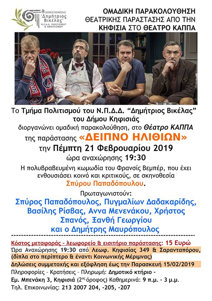 Το Τμήμα Πολιτισμού του Ν.Π.Δ.Δ. “Δημήτριος Βικέλας” του Δήμου Κηφισιάς διοργανώνει ομαδική παρακολούθηση, στο Θέατρο Κάππα της παράστασης...