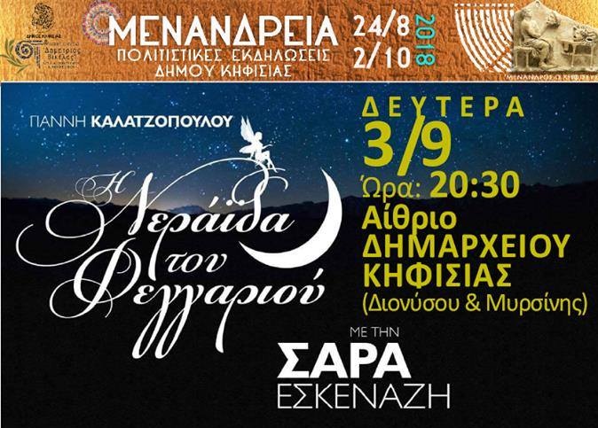 Στο πλαίσιο των πολιτιστικών εκδηλώσεων Μενάνδρεια 2018, τη Δευτέρα 3 Σεπτεμβρίου 2018, οι μικροί μας φίλοι ‘ταξίδεψαν’ στην Ιαπωνία, μέσα από το ονειρικό παραμύθι «Η Νεράιδα του Φεγγαριού» του Γιάννη Καλατζόπουλου, με πρωταγωνίστρια την Σάρα Εσκενάζη.