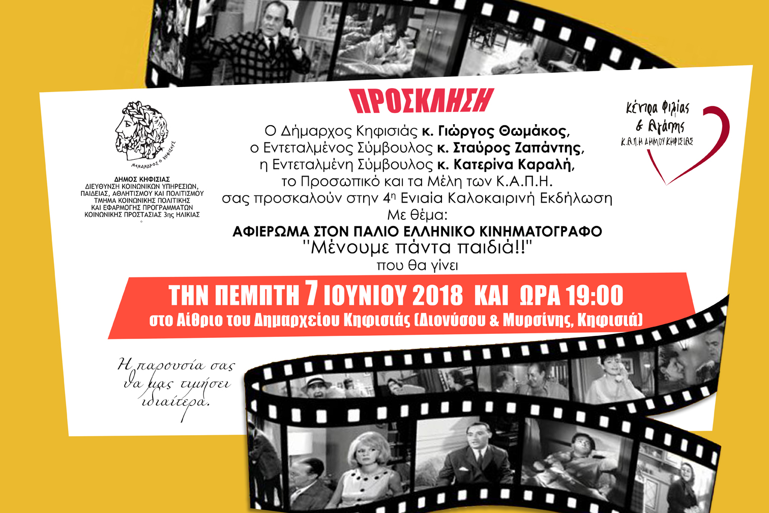 Μια μουσικο-θεατρική παράσταση που αφορά στην αίγλη του ελληνικού κινηματογράφου κι όπως εμείς τον αγαπήσαμε θα μας παρουσιάσουν τα μέλη των τεσσάρων ΚΑΠΗ του Δήμου Κηφισιάς την Πέμπτη 7 Ιουνίου 2018 και ώρα 19.00, στο Αίθριο του Δημαρχείου Κηφισιάς (Διονύσου και Μυρσίνης) στο πλαίσιο της  4ης Ενιαίας Καλοκαιρινής Γιορτής των ΚΑΠΗ του Δήμου μας.