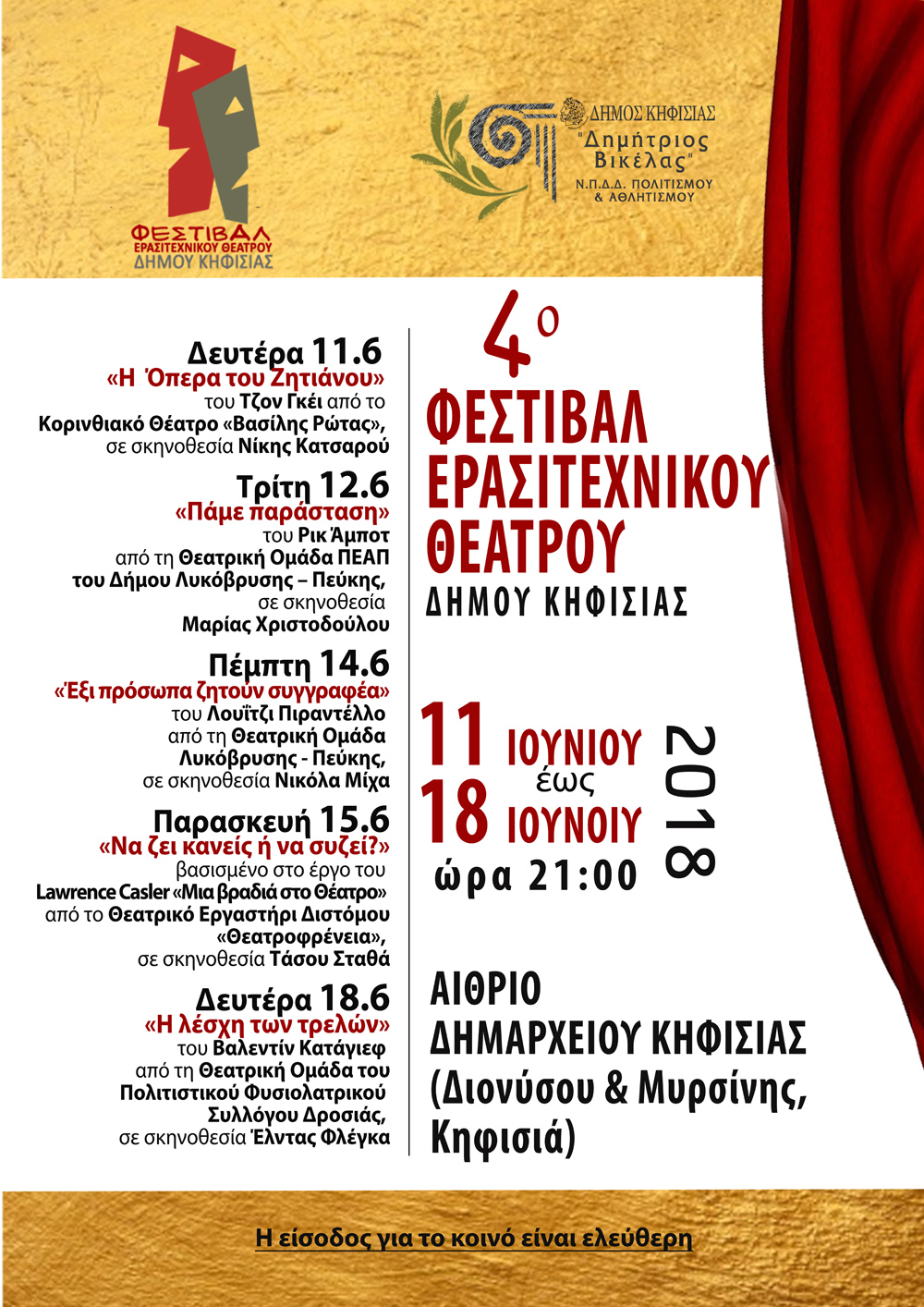 Το Ν.Π.Δ.Δ. Πολιτισμού και Αθλητισμού «Δημήτριος Βικέλας» Δήμου Κηφισιάς διοργανώνει για 4η χρόνια το Φεστιβάλ Ερασιτεχνικού Θεάτρου από Δευτέρα 11/6 έως Δευτέρα 18/6, στο Αίθριο του Δημαρχείου Κηφισιάς (Διονύσου & Μυρσίνης, Κηφισιά), όπου οι θεατές θα έχουν την ευκαιρία να απολαύσουν διαφόρων ειδών παραστάσεις, τις οποίες έχουν προσεγγίσει άρτια οι σκηνοθέτες αλλά και οι ερασιτέχνες - ηθοποιοί.
