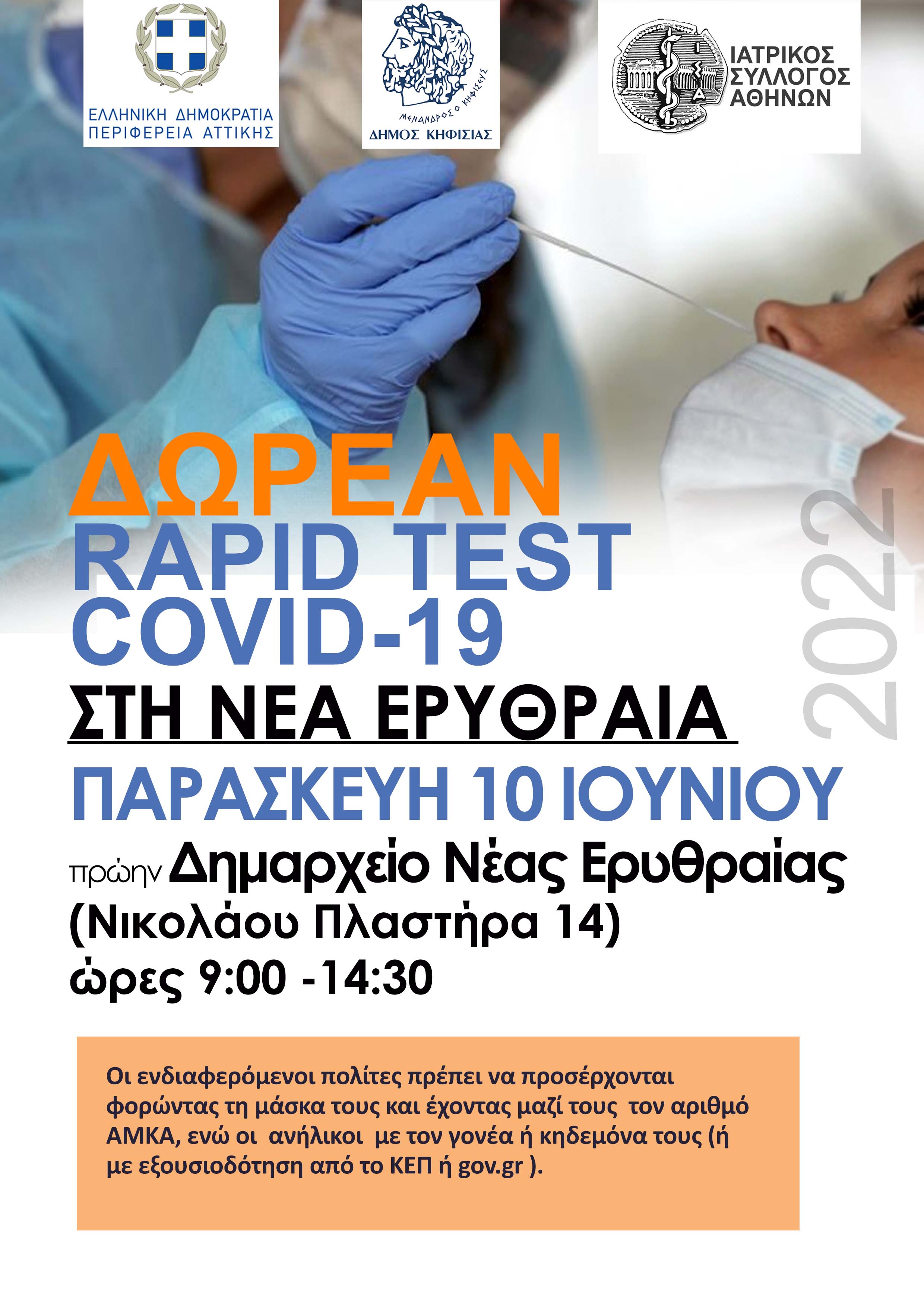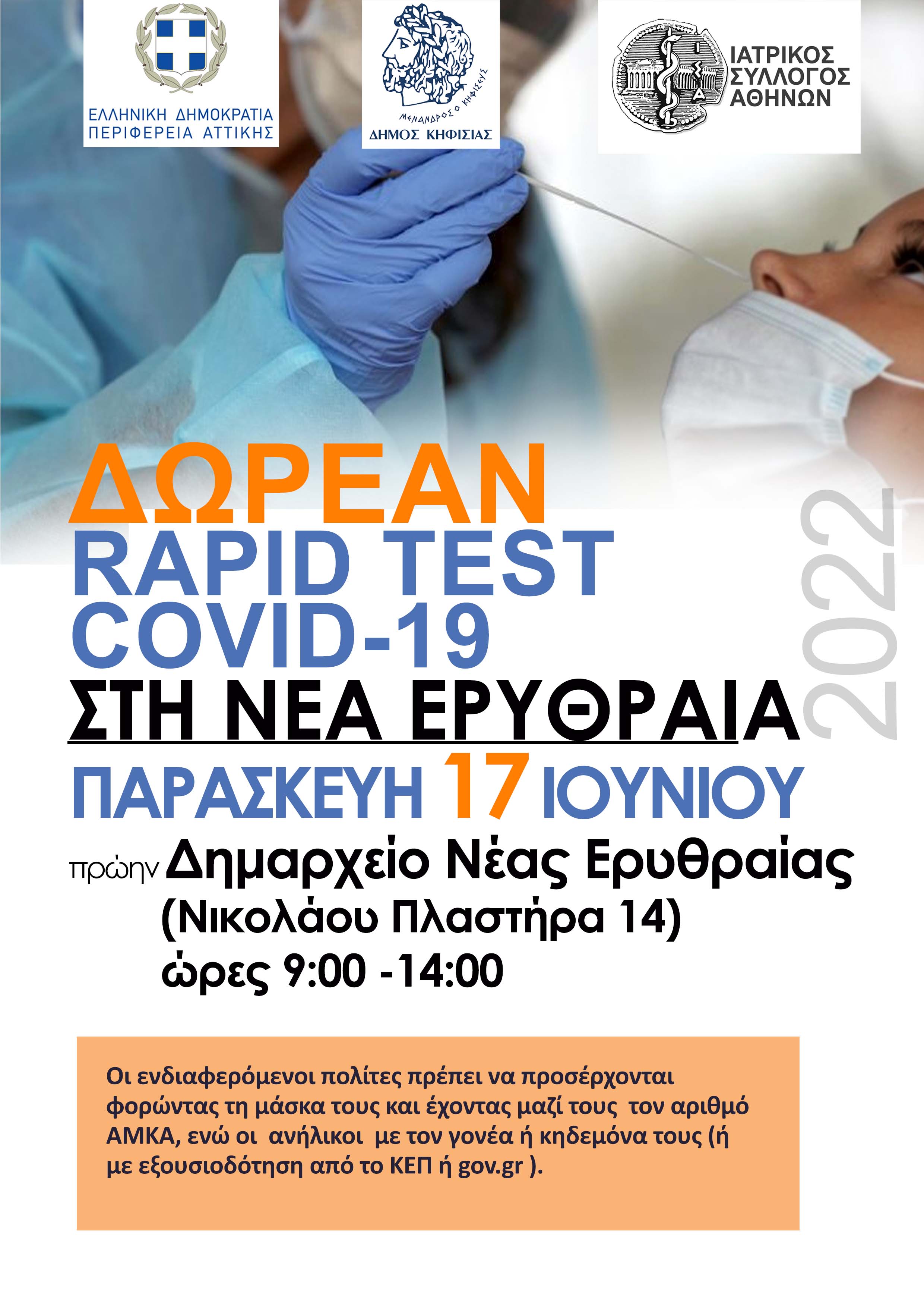 Ο Δήμος Κηφισιάς σε συνεργασία με την Περιφέρεια Αττικής και τον Ιατρικό Σύλλογο Αθηνών προχωρά στη διενέργεια δωρεάν rapid tests, στην περιοχή της Νέας Ερυθραίας.