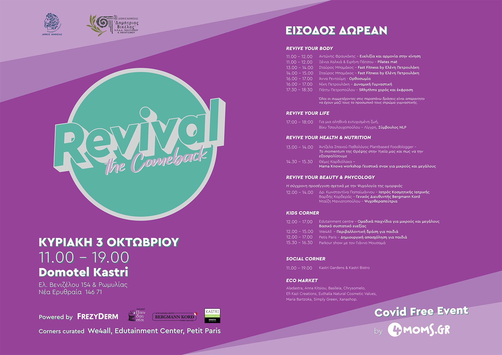 Την ημέρα θετικής ενέργειας και άσκησης «REVIVAL» στον Δήμο Κηφισιάς, διοργανώνει το site για τη σύγχρονη γυναίκα-μητέρα, 4moms.gr και τελεί υπό την αιγίδα και με την υποστήριξη του Δήμου μας και του ΝΠΔΔ «Δημήτριος Βικέλας».