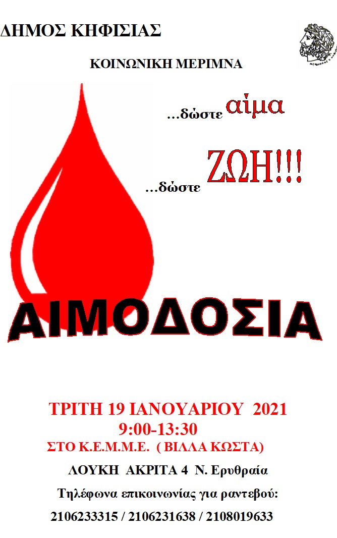 Με επιτυχία πραγματοποιήθηκε η Εθελοντική Αιμοδοσία που διοργάνωσε το ΝΠΔΔ «Κοινωνική Μέριμνα» του Δήμου Κηφισιάς, την Τρίτη 19 Ιανουαρίου 2021 στο ΚΕΜΜΕ για τη Δημοτική Τράπεζα Αίματος του Κέντρο Προαγωγής Υγείας «Δρυμπέτειο».