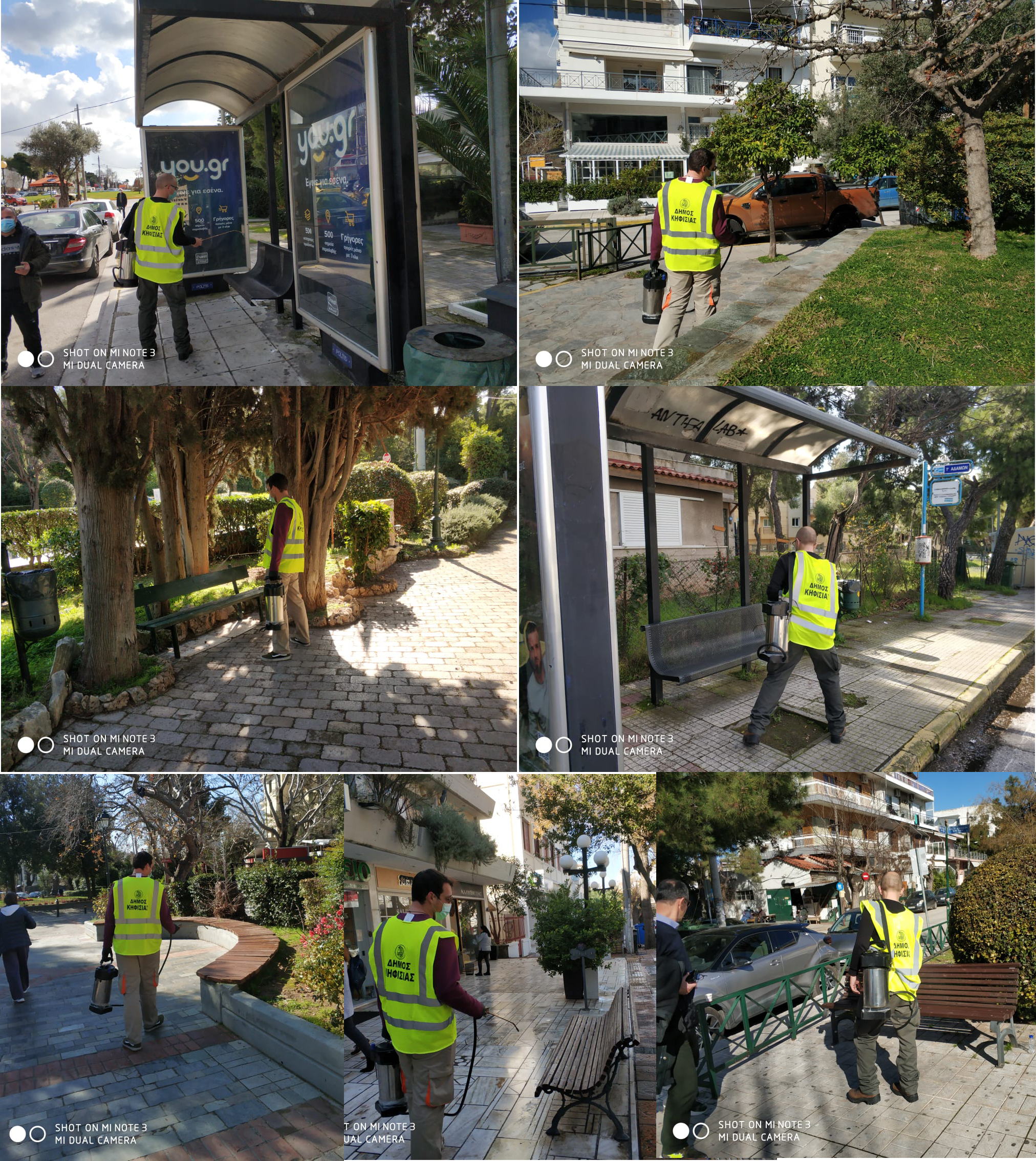 Ειδικό συνεργείο με κατάλληλο εξοπλισμό, απολυμαίνει σε εβδομαδιαία βάση στάσεις λεωφορείων, πλατείες και σημεία του Δήμου μας όπου συγκεντρώνονται πολίτες.