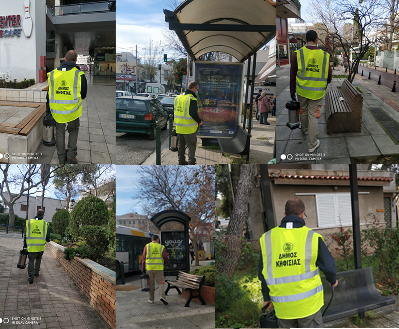 Ειδικό συνεργείο με κατάλληλο εξοπλισμό, απολυμαίνει σε εβδομαδιαία βάση στάσεις λεωφορείων, πλατείες και σημεία σε Κηφισιά, Νέα Ερυθραία και Νέα Κηφισιά όπου συγκεντρώνονται πολίτες.