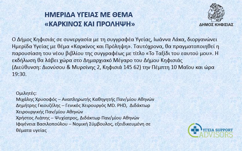 Ο Δήμος Κηφισιάς σε συνεργασία με τη συγγραφέα Υγείας, Ιωάννα Λάκα, διοργανώνει Ημερίδα Υγείας με θέμα «Καρκίνος και Πρόληψη». Ταυτόχρονα, θα πραγματοποιηθεί η παρουσίαση του νέου βιβλίου της συγγραφέως με τίτλο «Το Ταξίδι του εαυτού μου». Η εκδήλωση θα λάβει χώρα στο Δημαρχιακό Μέγαρο του Δήμου Κηφισιάς την Πέμπτη 10 Μαΐου και ώρα 19:30.