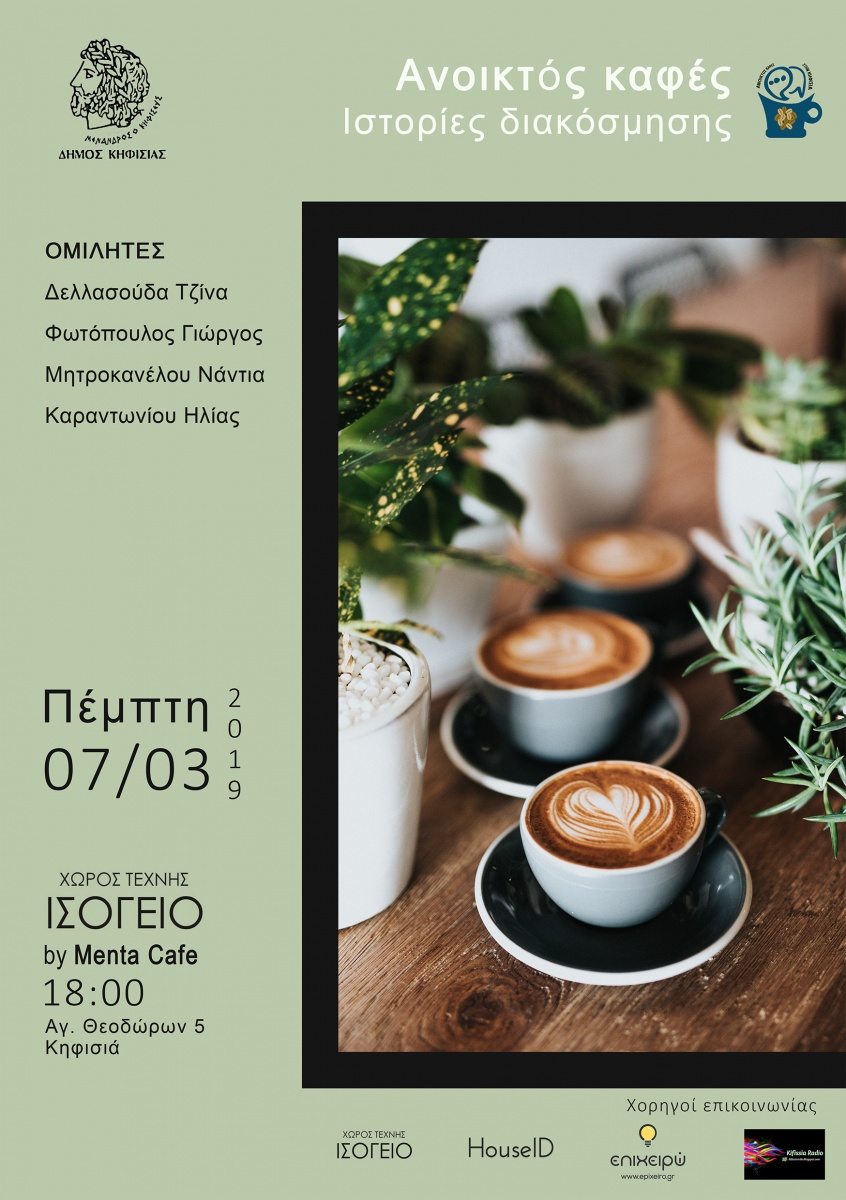 Την Πέμπτη 7 Μαρτίου στις 6μ.μ. θα έχουμε τη δυνατότητα να απολαύσουμε το καφεδάκι μας στο Χώρο Τέχνης ΙΣΟΓΕΙΟ by Menta Café, Αγίου Δημητρίου 14 στην Κηφισιά ακούγοντας ευφάνταστες ιστορίες διακόσμησης από αξιόλογους ομιλητές.