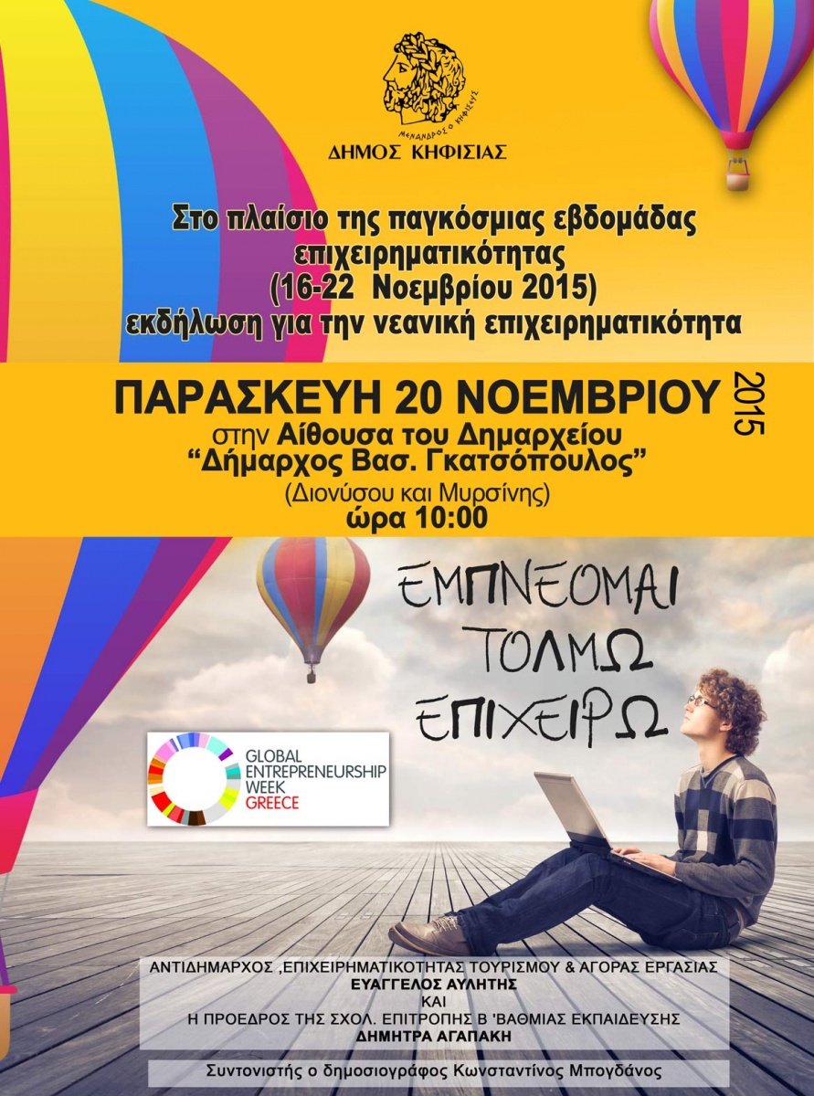 Στις 20 Νοεμβρίου 2015, Πραγματοποιήθηκε μία εκδήλωση στο Δημαρχιακό Κτίριο με όλα τα Λύκεια της Κηφισιάς, για την γνωριμία και την εξοικείωση των παιδιών ιδιαίτερα της Γ’ Λυκείου με την έννοια του «επιχειρείν» νέοι και επιτυχημένοι στον χώρο τους επιχειρηματίες παρουσίασαν την δική τους ενδιαφέρουσα προσωπική ιστορία, διαδραστικά και σε συνεχή διάλογο με τα παιδιά. Την όλη εκδήλωση συντόνισε ο δημοσιογράφος Κωνσταντίνος Μπογδάνος.