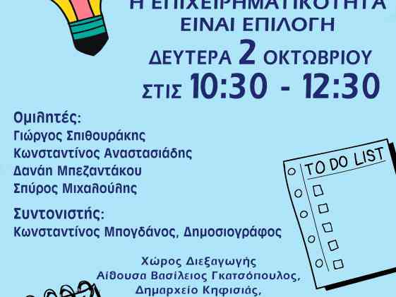Το Τμήμα Επιχειρηματικότητας και Τουρισμού διοργανώνει εκδήλωση επιχειρηματικότητας με τίτλο «Η Επιχειρηματικότητα είναι Επιλογή», τη Δευτέρα 2 Οκτ