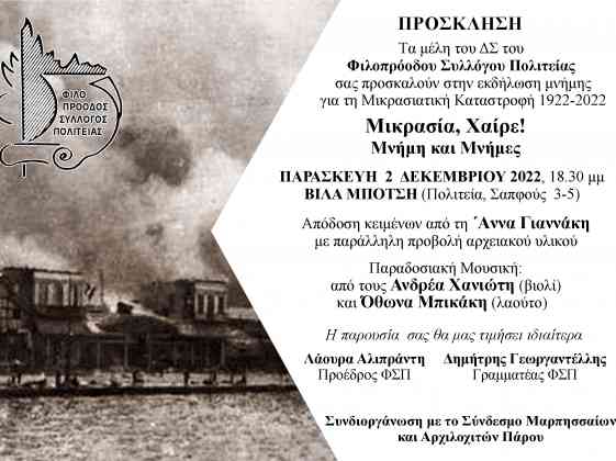 Ο Φιλοπρόοδος Σύλλογος Πολιτείας με αφορμή τα 100 χρόνια από τη Μικρασιατική Κατασ