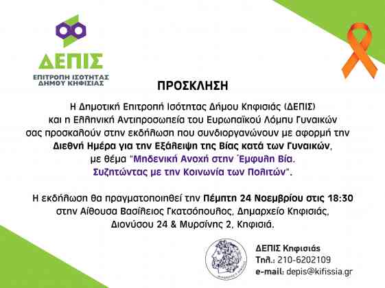 Με αφορμή την 25η Νοεμβρίου, Παγκόσμια Ημέρα για την Εξάλειψη της Βίας κατά των Γυναικών, η Δημοτική Επιτροπή Ισότητας (ΔΕΠΙΣ) του Δήμου