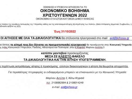 Στο πλευρό των πολιτών που αντιμετωπίζουν οικονομικές δυσκολίες στέκεται και φέτος ο Δήμος Κηφισιάς με το επίδομα των Χριστουγέννων 2022,