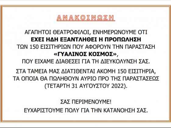 Αγαπητοί θεατρόφιλοι, λόγω της μεγάλης ζήτησης εισιτηρίου για την παράσταση «ΓΥΑΛΙΝΟΣ ΚΟΣΜΟΣ» (ΤΕΤΑΡΤΗ 31 ΑΥΓΟΥΣΤΟΥ, ΑΙΘΡΙΟ ΔΗΜΑΡΧΕΙΟΥ ΚΗΦΙΣΙΑΣ), τ