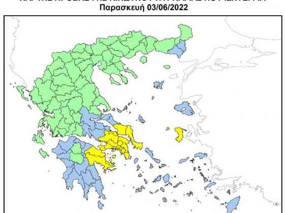 Σύμφωνα με τον Χάρτη Πρόβλεψης Κινδύνου Πυρκαγιάς που εκδίδει η ΓΓΠΠ, για αύριο Παρασκευή 3/6 προβλέπεται: