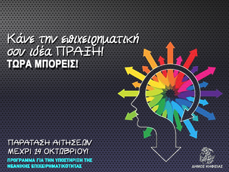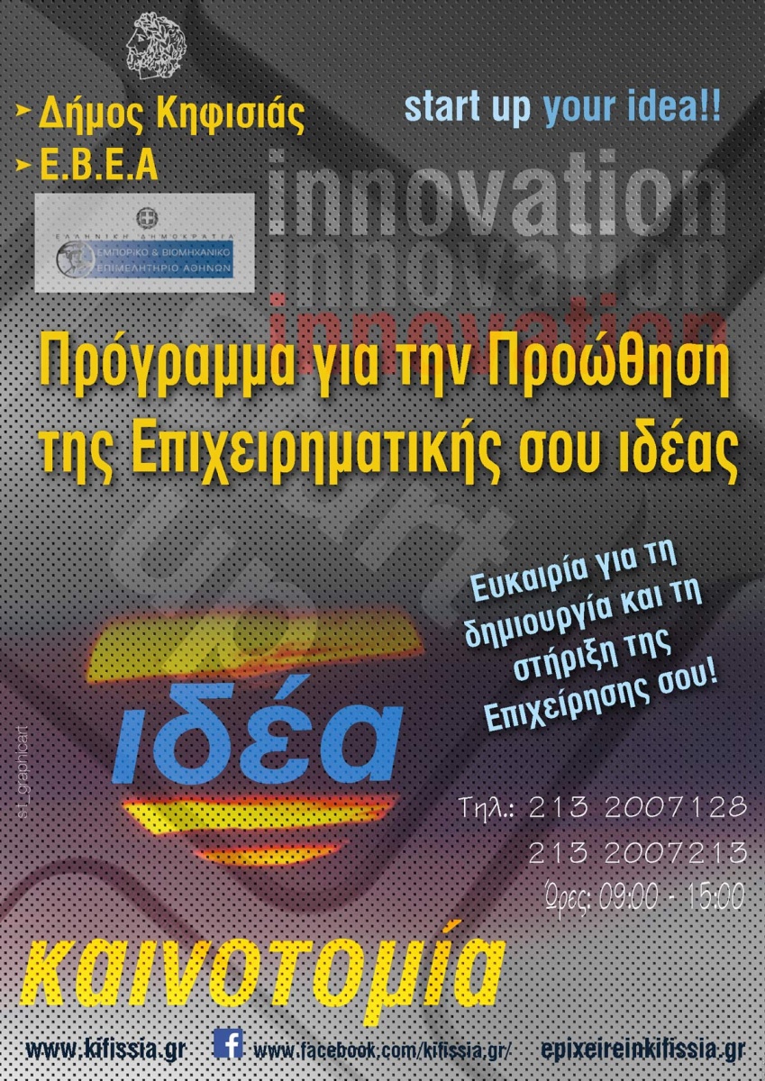 Με στόχο τη στήριξη της νεανικής επιχειρηματικότητας, ο Δήμος Κηφισιάς σε συνεργασία με το Εμπορικό και Βιομηχανικό Επιμελητήριο Αθηνών (E.B.E.A.), πρόκειται να προσφέρει τη δυνατότητα σε φιλόδοξους νέους και νέες να υλοποιήσουν καινοτόμες επιχειρηματικές ιδέες.
