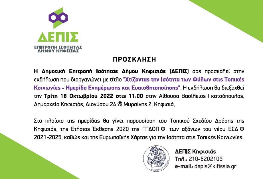 Η Δημοτική Επιτροπή Ισότητας (ΔΕΠΙΣ) Κηφισιάς διοργανώνει εκδήλωση με θέμα «Χτίζοντας την Ισότητα των Φύλων στις Τοπικές Κοινωνίες – Ημερίδα Ενημέρωσης και Ευαισθητοποίησης», που θα πραγματοποιηθεί την Τρίτη 18 Οκτωβρίου στις 11:00 στην Αίθουσα Βασίλειος Γκατσόπουλος Δημαρχείο Κηφισιάς, Διονύσου 24 & Μυρσίνης 2, Κηφισιά.