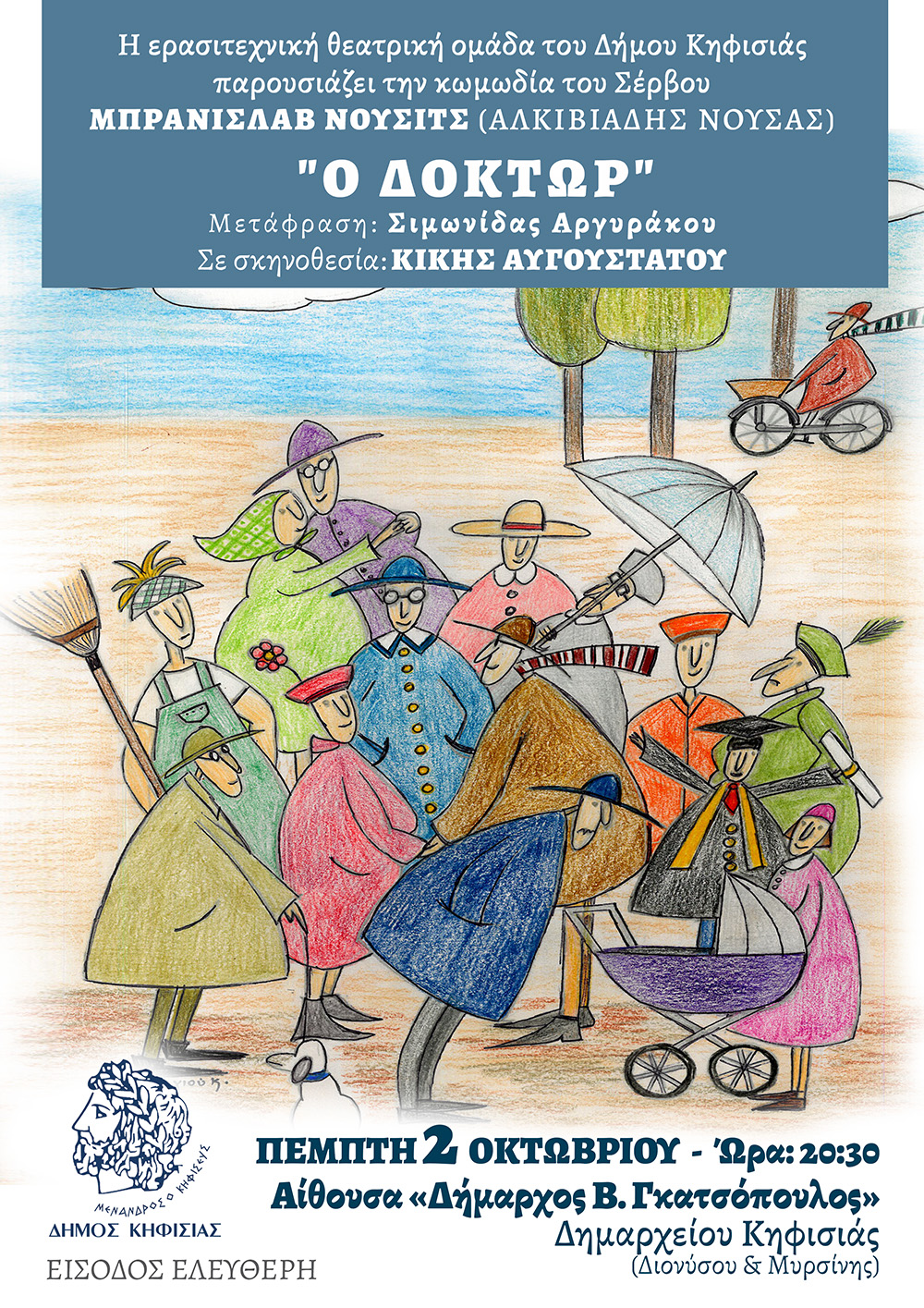 Σας ενημερώνουμε ότι η προγραμματισμένη εκδήλωση με τίτλο «Ο ΔΟΚΤΩΡ», η οποία έχει προγραμματιστεί για Πέμπτη 02/10/25 & ώρα 20:30 στο Αίθριο Δημαρχείου Κηφισιάς, θα πραγματοποιηθεί λόγω καιρικών συνθηκών, εντός της αιθούσης του Πολιτιστικού «Δήμαρχος Β. Γκατσόπουλος».