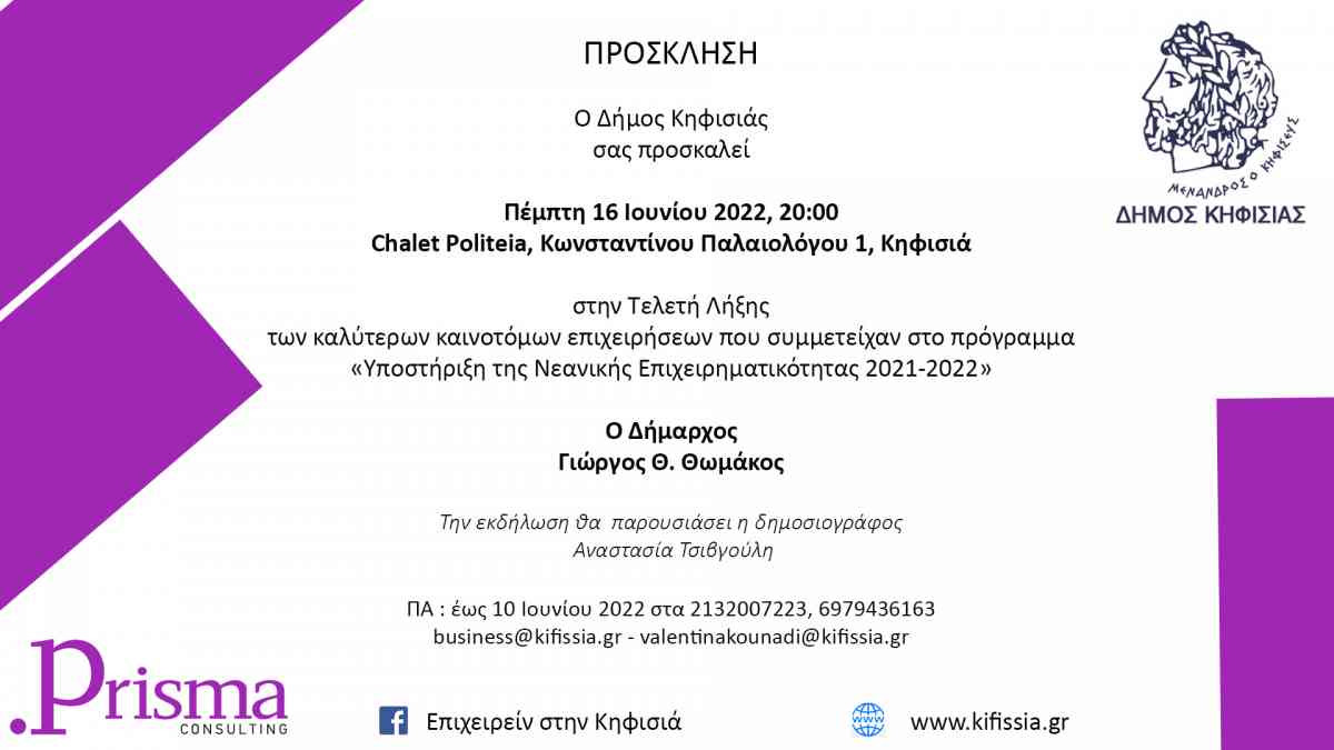 Βραβεύσεις των καλύτερων καινοτόμων επιχειρήσεων που συμμετείχαν στο πρόγραμμα «Υποστήριξη της Νεανικής Επιχειρηματικότητας 2021-2022»
