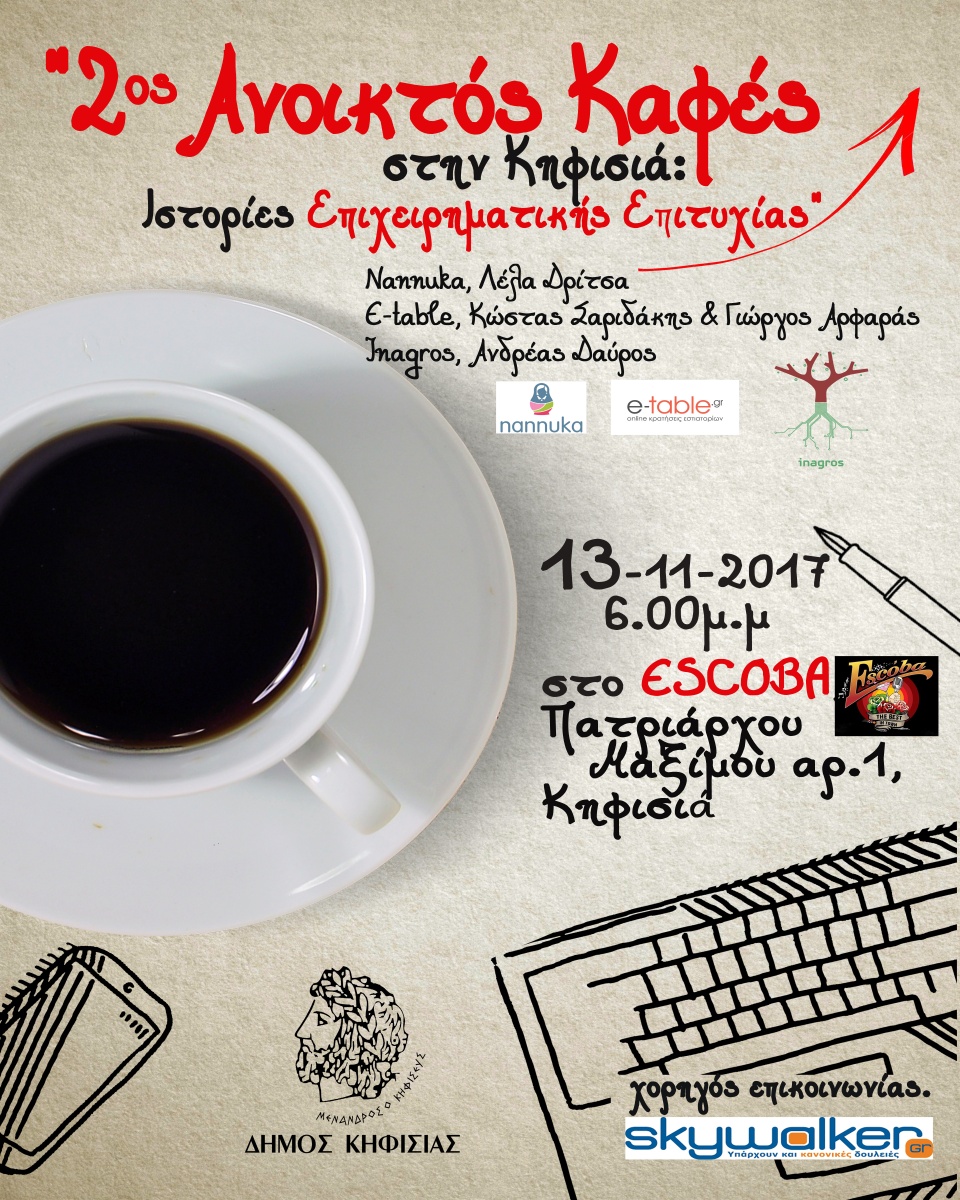 Ανοικτός Καφές στην Κηφισιά: Ιστορίες Επιχειρηματικής Επιτυχίας Τη Δευτέρα 16 Απριλίου πραγματοποιήθηκε με μεγάλη επιτυχία ο Ανοικτός Καφές στην Κηφισιά στο πιο παραδοσιακό καφέ της Κηφισιάς, στο Βάρσο, όπου ακούσαμε 4 νέες ιστορίες επιχειρηματικής επιτυχίας.