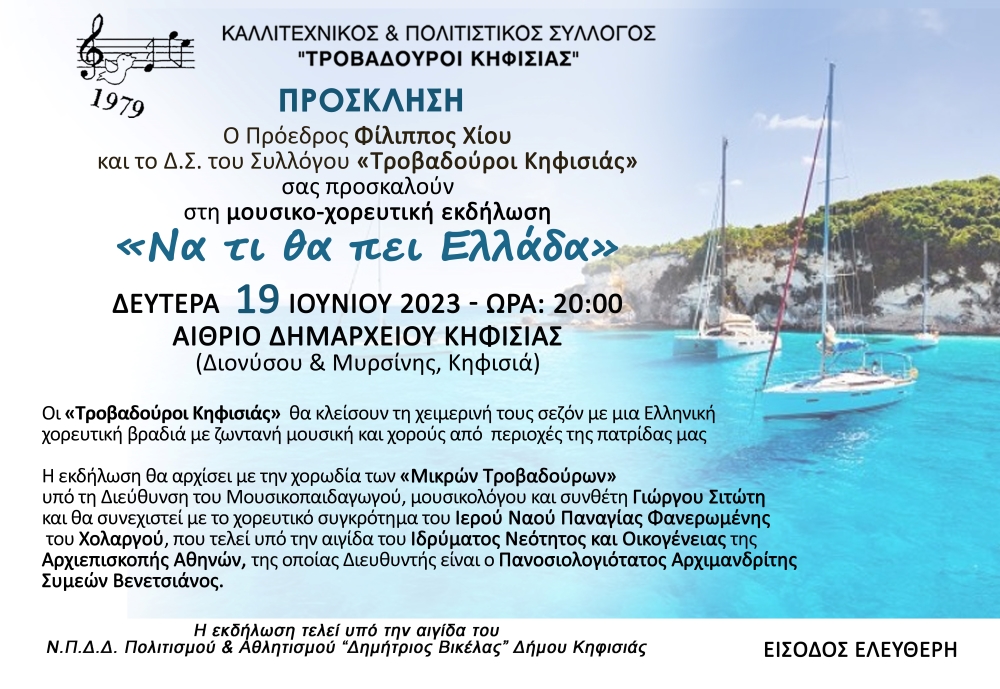 Ο Πρόεδρος Φίλιππος Χίου και το Δ.Σ. του Συλλόγου «Τροβαδούροι Κηφισιάς» σας προσκαλούν στη μουσικοχορευτική εκδήλωση...