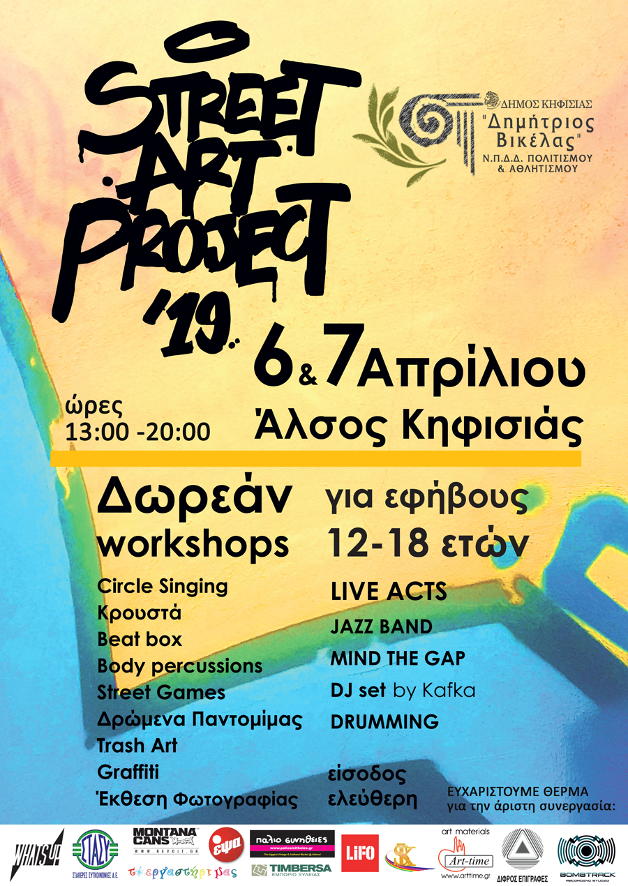 Το Ν.Π.Δ.Δ. Πολιτισμού & Αθλητισμού «Δημήτριος Βικέλας» του Δήμου Κηφισιάς διοργανώνει στις 6 & 7 Απριλίου 2019 (ώρες 13:00 – 20:00) στο Άλσος Κηφισιάς «Δημήτρης Ζωμόπουλος» το πρώτο Street Art Project για εφήβους.