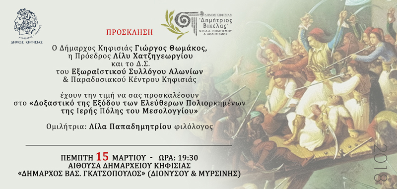 Ο Εξωραϊστικός Σύλλόγος Αλωνίων & Παραδοσιακού Κέντρου Κηφισιάς διοργανώνει στην Αίθουσα Δημαρχείου Κηφισιάς «Δήμαρχος Βασ. Γκατσόπουλος» (Διονύσου & Μυρσίνης) την Πέμπτη 15 Μαρτίου 2018 κι ώρα: 19:30, ιστορικό ντοκυμαντέρ για το «Δοξαστικό της Εξόδου των Ελεύθερων Πολιορκημένων της Ιερής Πόλης του Μεσολογγίου».