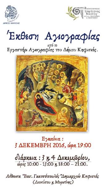 Ο Οργανισμός Πολιτισμού & Αθλητισμού του Δήμου Κηφισιάς και το Εργαστήρι Αγιογραφίας του Δήμου με δασκάλα την κα Μαρία Καρδαρά, διοργανώνουν έκθεση Αγιογραφίας στην Αίθουσα του Δημαρχείου Κηφισιάς «Δήμαρχος Βας. Γκατσόπουλος» (Διονύσου & Μυρσίνης).