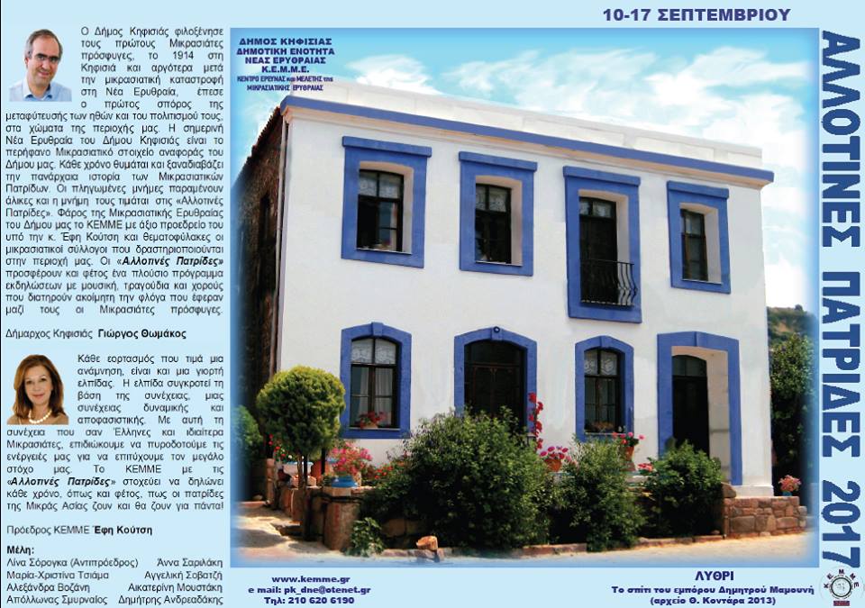 Μουσική, τραγούδι, ομιλίες, παρουσιάσεις βιβλίων, προβολή ντοκυμαντέρ, αθλητικές δραστηριότητες, ξεναγήσεις, όλα με σημείο εκκίνησης τις αλησμόνητες πατρίδες περιλαμβάνουν οι εκδηλώσεις μνήμης «Αλλοτινές Πατρίδες» που διοργανώνει και φέτος το Κέντρο Έρευνας και Μελέτης της Μικρασιατικής Νέας Ερυθραίας (ΚΕΜΜΕ) του Δήμου Κηφισιάς και οι Μικρασιατικοί Σύλλογοι της περιοχής, από τις 10 Σεπτεμβρίου έως τις 17 Σεπτεμβρίου 2017.