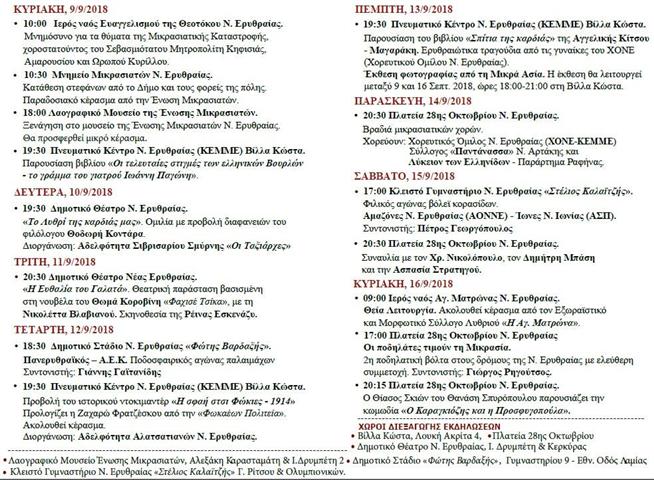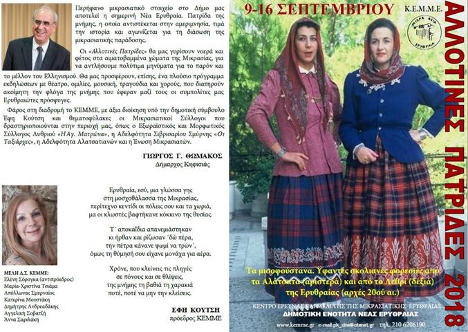 Το Κέντρο Έρευνας και Μελέτης της Μικρασιατικής Ερυθραίας του Δήμου Κηφισιάς, σε συνεργασία με τους μικρασιατικούς συλλόγους της περιοχής διοργανώνει από 9 – 16 Σεπτεμβρίου τις «Αλλοτινές Πατρίδες 2018». Οι φετινές εκδηλώσεις περιλαμβάνουν μουσική, τραγούδι, χορούς, ομιλίες, παρουσιάσεις βιβλίων, προβολές ντοκιμαντέρ, αθλητικές δραστηριότητες, ξεναγήσεις, έκθεση φωτογραφίας, θεατρική παράσταση, θέατρο σκιών για μικρούς και μεγάλους, ποδηλατική βόλτα όλα με σημείο εκκίνησης τις αλησμόνητες πατρίδες.