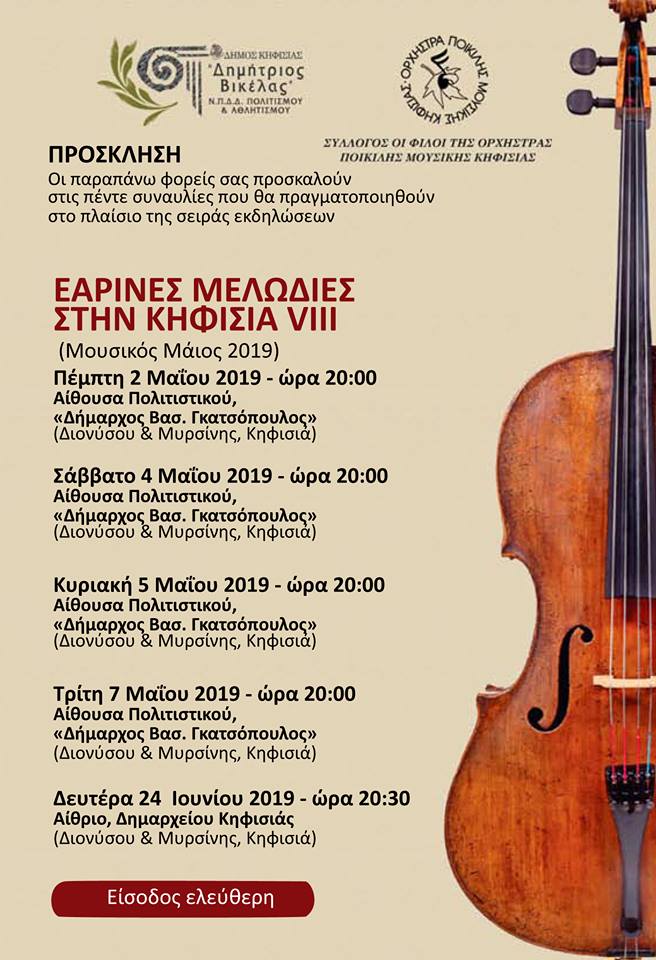 Ο Σύλλογος «Οι φίλοι της Ορχήστρας Ποικίλης Μουσικής Κηφισιάς» σε συνεργασία με το Ν.Π.Δ.Δ. Πολιτισμού και Αθλητισμού «Δημήτριος Βικέλας» του Δήμου Κηφισιάς, συνδιοργανώνουν πέντε συναυλίες που θα πραγματοποιηθούν στο πλαίσιο της καθιερωμένης σειράς εκδηλώσεων «Εαρινές Μελωδίες στην Κηφισιά VΙΙΙ».