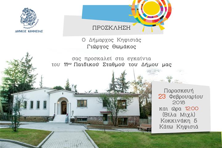 Ο Δήμαρχος Κηφισιάς Γιώργος Θωμάκος σας προσκαλεί στα εγκαίνια του 11ου Παιδικού Σταθμού του Δήμου μας, την Παρασκευή 23 Φεβρουαρίου 2018 και ώρα 12.00 Βίλλα Μιχλ Κοκκινάκη 5, Κάτω Κηφισιά