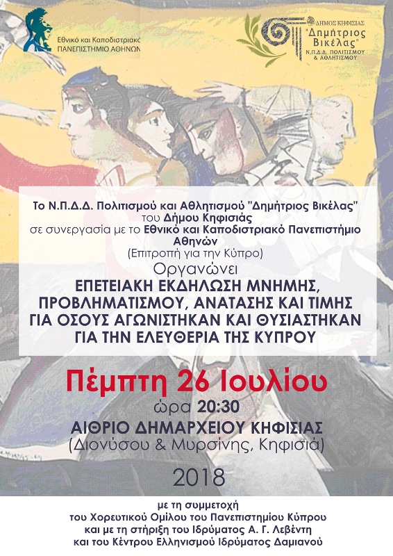 Το Ν.Π.Δ.Δ. Πολιτισμού & Αθλητισμού «Δημήτριος Βικέλας» σας ενημερώνει ότι ματαιώνεται η Επετειακή Εκδήλωση-Ομιλία για την Κύπρο, που είχε προγραμματιστεί για την Πέμπτη 26 Ιουλίου 2018, λόγω του τριήμερου πένθους για τα θύματα της καταστροφικής πυρκαγιάς.