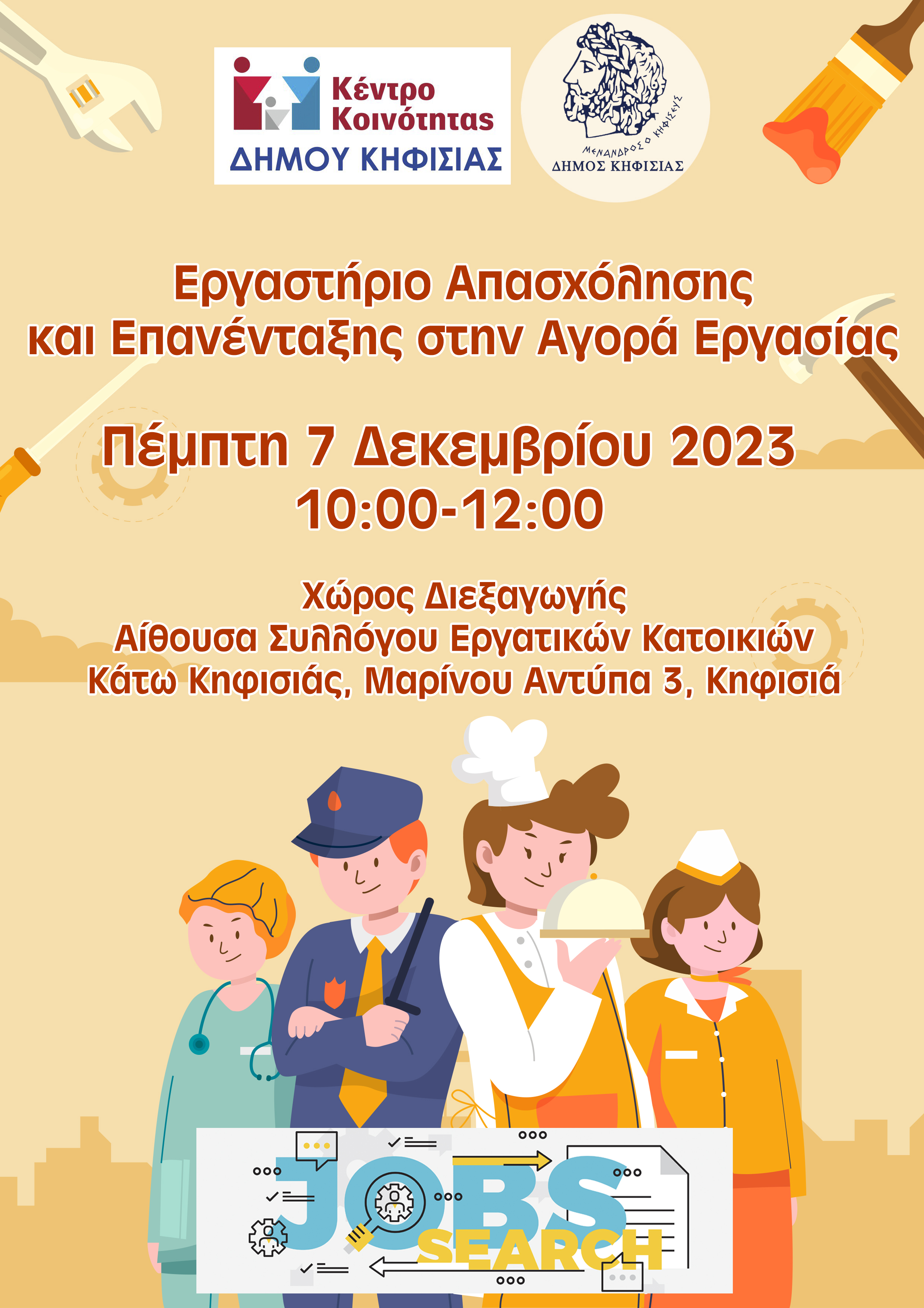 Το Κέντρο Κοινότητας του Δήμου Κηφισιάς διοργανώνει Εργαστήριο Απασχόλησης και Επανένταξης στην Αγορά Εργασίας την Πέμπτη 7 Δεκεμβρίου στις 10:00-12:00 στην Αίθουσα Συλλόγου Εργατικών Κατοικιών Κάτω Κηφισιάς.