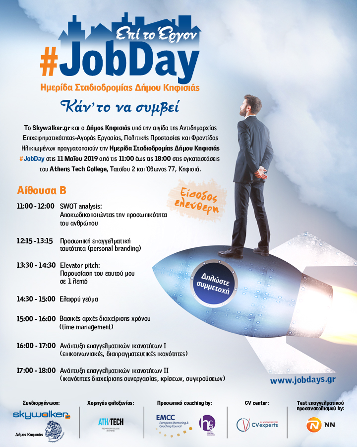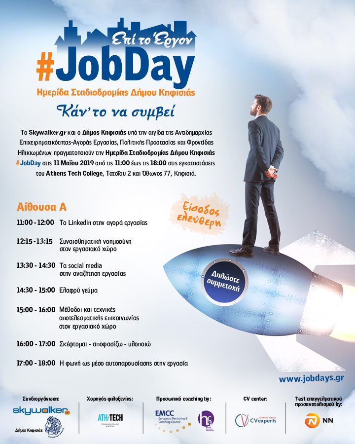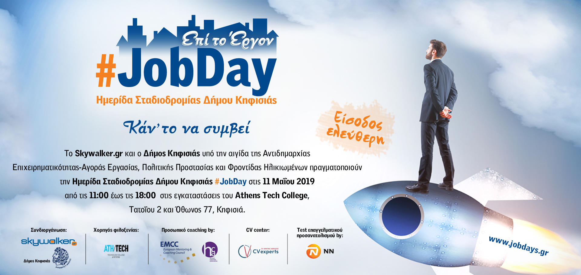 Ο Δήμος Κηφισιάς υπό την αιγίδα της Αντιδημαρχίας Επιχειρηματικότητας-Αγοράς Εργασίας, Πολιτικής Προστασίας και Φροντίδας Ηλικιωμένων, διοργανώνει για τρίτη χρονιά σε συνεργασία με το skywalker.gr την Ημερίδα Σταδιοδρομίας Δήμου Κηφισιάς#Jobday. Πρόκειται για μία δράση που περιλαμβάνει εργαστήρια αναζήτησης εργασίας και ανάπτυξης επαγγελματικών δεξιοτήτων, προσωπικό coaching και δωρεάν αξιολόγηση βιογραφικών σημειωμάτων. Επίσης, τη φετινή χρονιά θα πραγμαποιηθούν για πρώτη φορά δωρεάν τεστ επαγγελματικού προσανατολισμού.