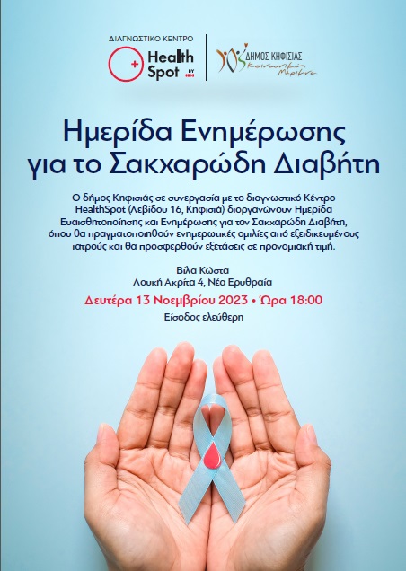 O Δήμος Κηφισιάς σε συνεργασία με το διαγνωστικό Kέντρο HealthSpot (Λεβίδου 16, Κηφισιά) διοργανώνουν Ημερίδα Ευαισθητοποίησης και Ενημέρωσης για τον Σακχαρώδη Διαβήτη, με αφορμή το Νοέμβριο, Μήνα Ευαισθητοποίησης για το Διαβήτη. Η ημερίδα θα διεξαχθεί τη Δευτέρα 13 Νοεμβρίου 2023 και ώρα 18:00, στη βίλα Κώστα (Λουκή Ακρίτα 4, Νέα Ερυθραία).