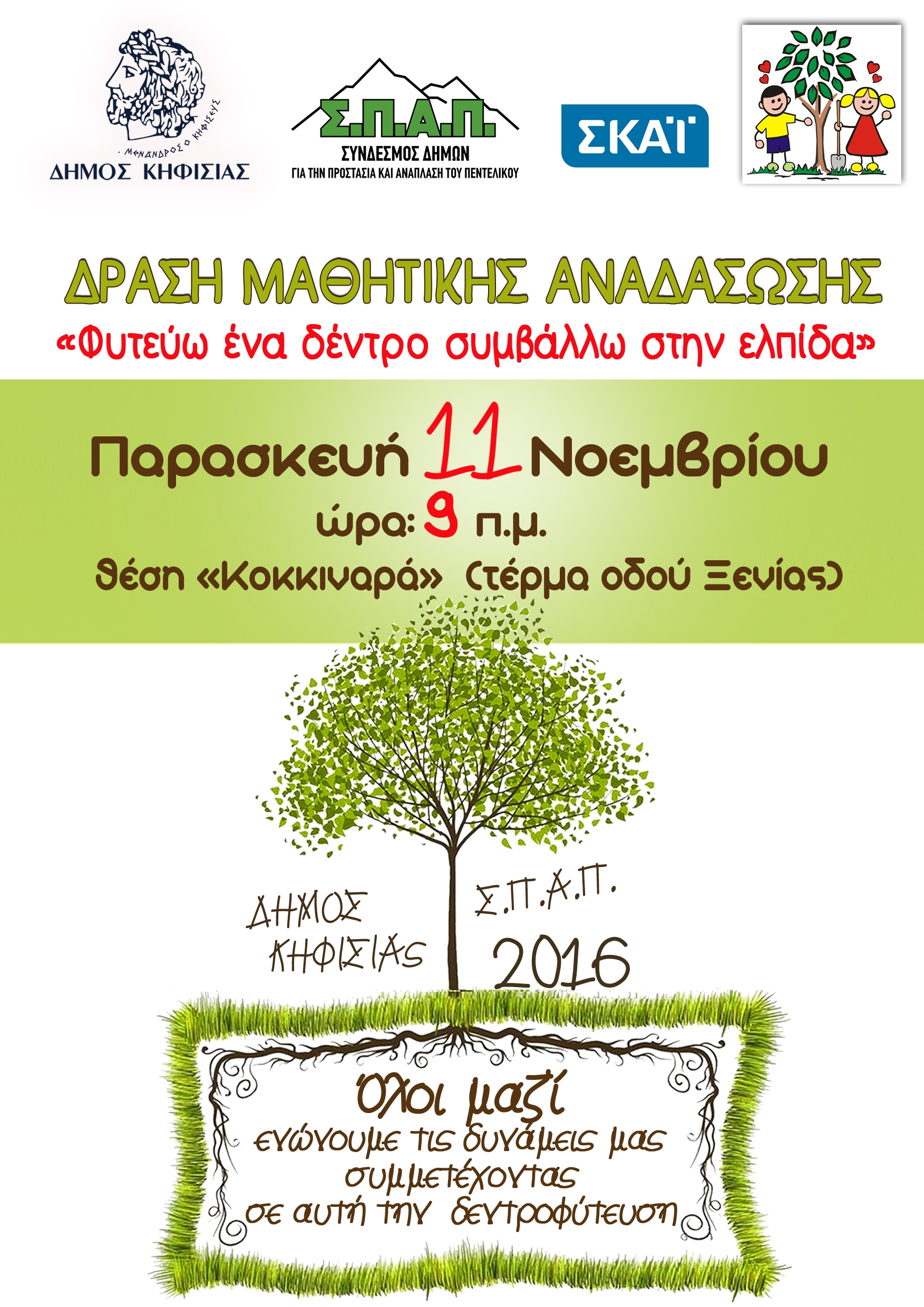 Ο Δήμος Κηφισιάς και ο Σύνδεσμος Δήμων για την Προστασία και Ανάπλαση του Πεντελικού (Σ.Π.Α.Π), σε συνεργασία με τον Ραδιοτηλεοπτικό Σταθμό ΣΚΑΪ οργανώνουν μαθητική αναδάσωση, η οποία θα πραγματοποιηθεί στην θέση «Κοκκιναρά» (τέρμα οδού Ξενίας) την Παρασκευή 11 Νοεμβρίου 2016 στις 9 πμ. Μέσα στο 2016 θα ακολουθήσουν και άλλες δράσεις αναδάσωσης στον Δήμο μας.