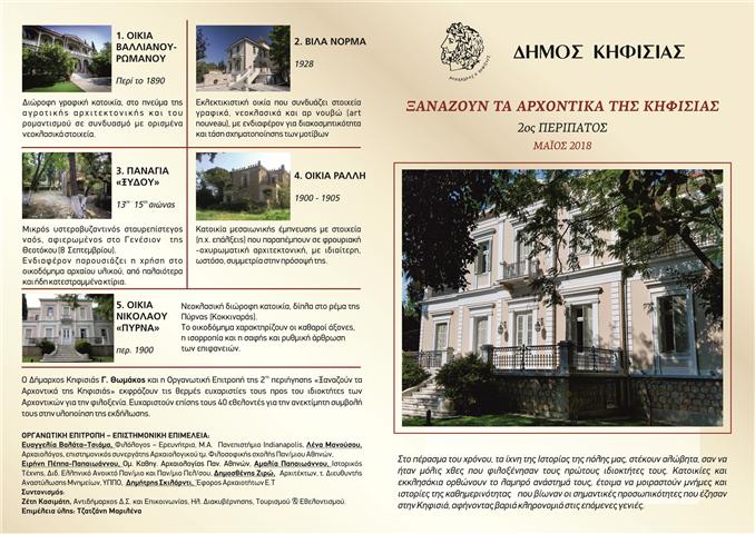 Ο Δήμος Κηφισιάς θα πραγματοποιήσει στις 20 Μαΐου 2018 την δεύτερη νοσταλγική περιήγηση σε Αρχοντικά της Κηφισιάς, δίνοντας την ευκαιρία στους συμμετέχοντες να ακούσουν την ιστορία της πόλης μας και να μάθουν για την ποικιλία των αρχιτεκτονικών ρυθμών και επιρροών.