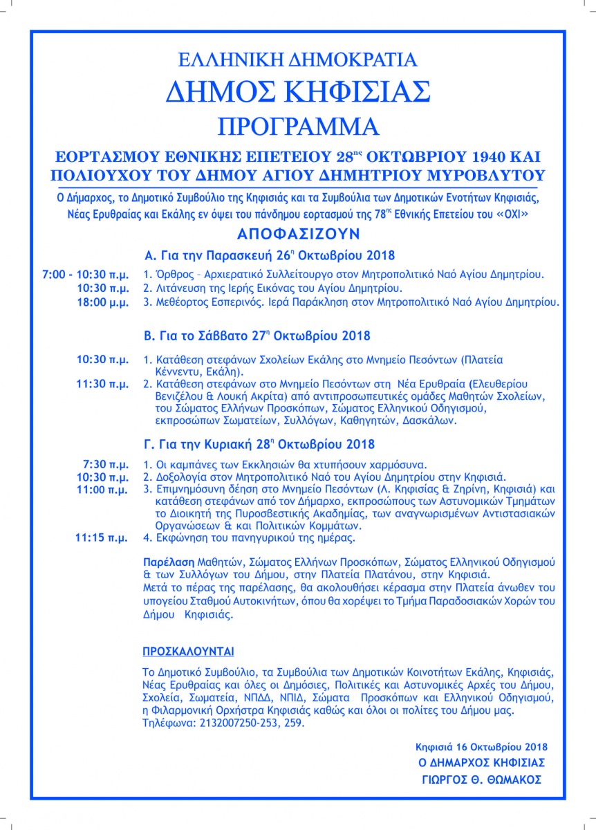 Ο Δήμος Κηφισιάς γιορτάζει με κάθε επισημότητα την επέτειο της 28ης Οκτωβρίου και προσκαλεί τους πολίτες να τιμήσουν με την παρουσία τους τις εορταστικές εκδηλώσεις.