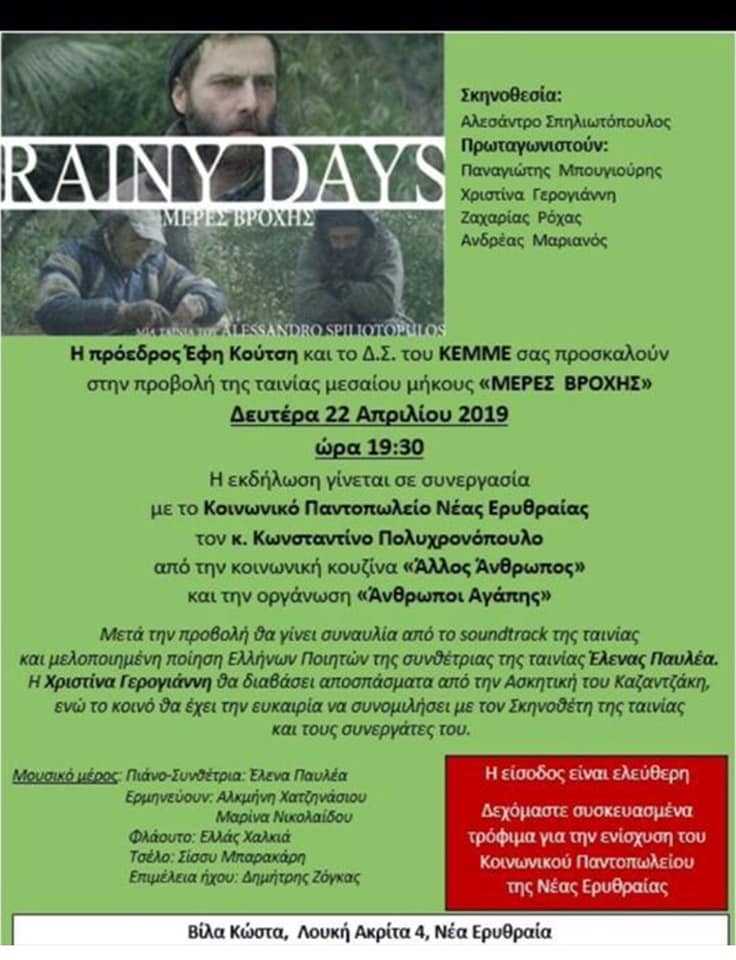 Η πρόεδρος του Κέντρου Έρευνας και Μελέτης της Μικρασιατικής Ερυθραίας (ΚΕΜΜΕ) Έφη Κούτση και το Δ.Σ. ποσκαλούν την Δευτέρα 22 Απριλίου 201 και ώρα 19:30 στην προβολή της ταινίας μεσαίου μήκους «ΜΕΡΕΣ ΒΡΟΧΗΣ» του Αλεσάντρο Σπηλιωτόπουλος, με τους ηθοποιούς Παναγιώτη Μπουγιούρη, Χριστίνα Γερογιάννη, Ζαχαρία Ρόχα κα Ανδρέα Μαριανό.