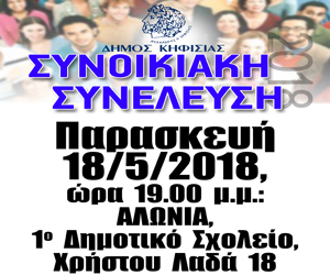 Παρασκευή 18/5/2018 και ώρα 19.00 Συνοικιακή Συνέλευση με τη συμμετοχή των κατοίκων της συνοικίας Αλωνίων στο 1ο Δημοτικό Σχολείο Κηφισιάς (Χρήστου Λαδά 18).