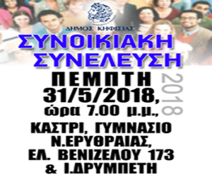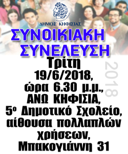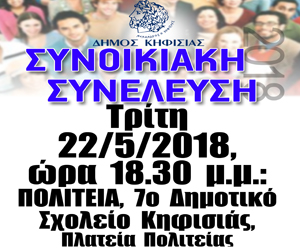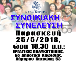 Πέμπτη 24/5/2018 και ώρα 18.30 Συνοικιακή Συνέλευση με τη συμμετοχή των κατοίκων της Νέας Κηφισιάς (από Ελαιών έως Δρυμώνος) στο Γ ΚΑΠΗ (Κηφισού και Αγραύλης).