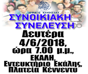 Δευτέρα 4/6/ 2018 και ώρα 19.00 με τη συμμετοχή των κατοίκων της Εκάλης, Εντευκτήριο Εκάλης (Πλατεία Κέννεντυ).